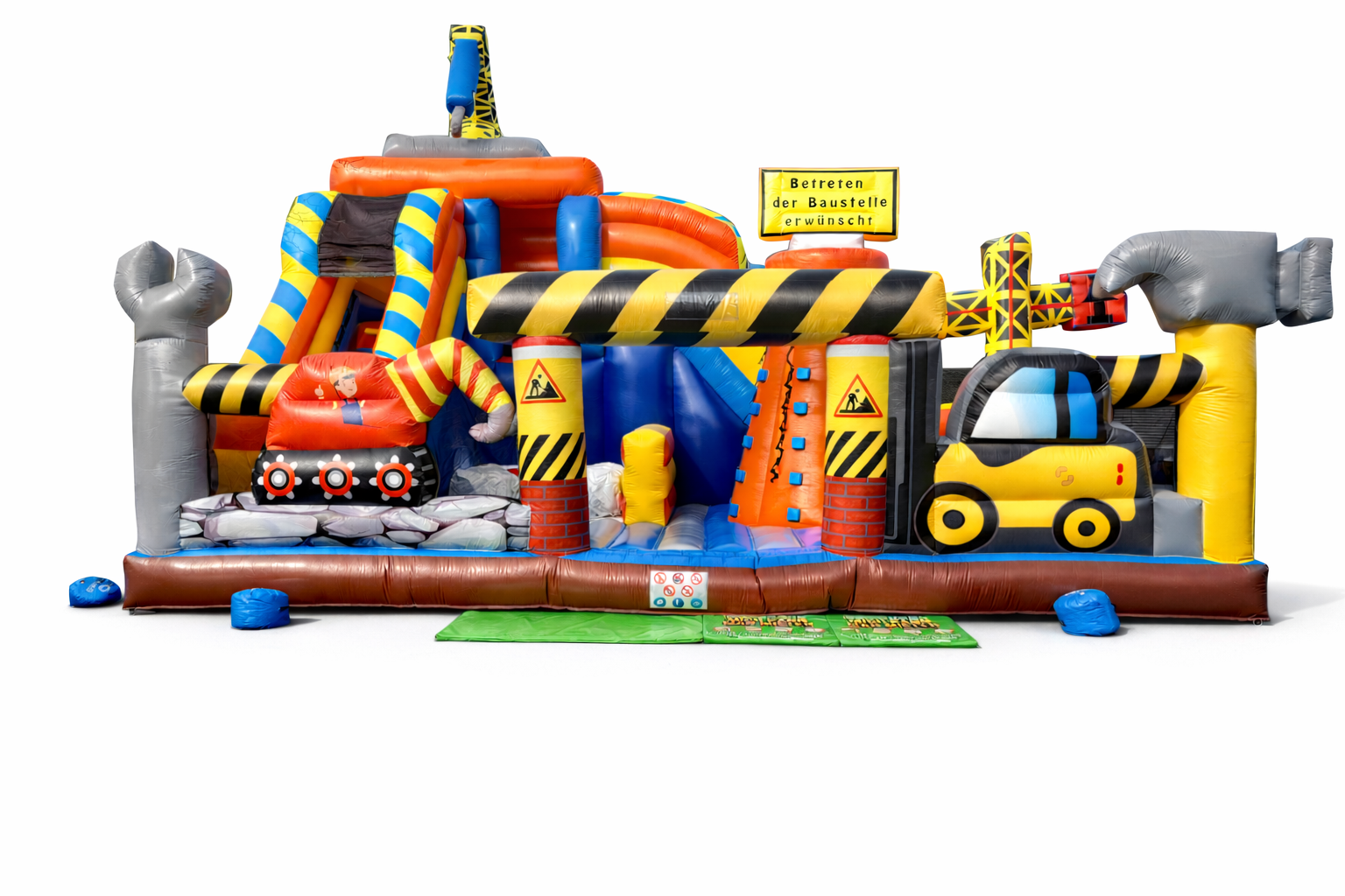 Die XXL Hüpfburg Baustelle ist ein besonderes Highlight für jedes große Event. Mit echten Freisprungkissen bietet sie Spaß und Abenteuer für Klein und Groß. Ausgestattet mit einer großen Rutsche, einem Kletterberg und einer riesigen Hüpffläche, ist sie perfekt für Stadtfeste, Firmenveranstaltungen oder Neueröffnungen. Mit ihren beeindruckenden Maßen von 10,5 x 8 Metern und einer Höhe von 8,5 Metern ist diese Hüpfburg schon von weitem ein echter Blickfang. Sorgen Sie für unvergessliche Momente und strahlende Gesichter bei Ihrem nächsten Event!