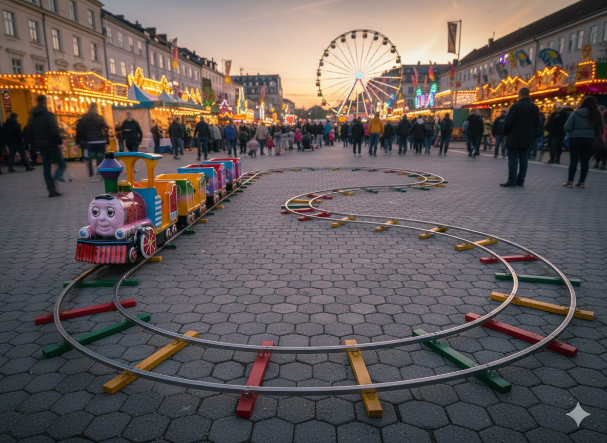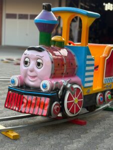 Die Bahn bewegt sich auf einer rund 32 Meter langen Schienenstrecke und kann bis zu 7 Kinder gleichzeitig mitnehmen. Sie fährt in einem angenehmen, ruhigen Tempo – perfekt für eine sichere und entspannte Rundfahrt.